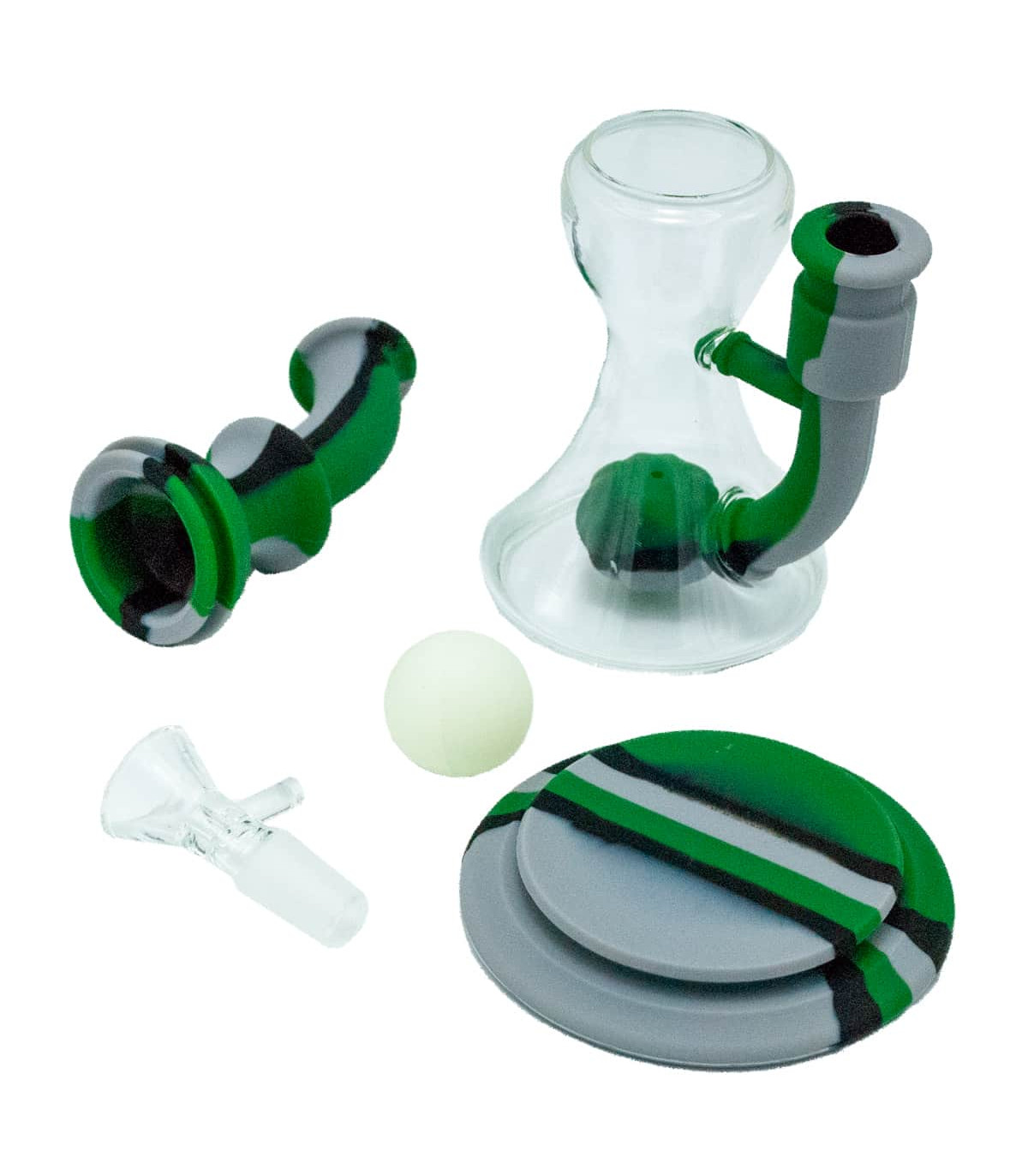 Construido con una base y una parte alta de silicona, este bong asegura un agarre firme en cualquier superficie y proporciona protección adicional contra golpes. La sección de cristal en la parte media permite ver el nivel del agua y la bola fluorescente, creando un efecto visual impresionante, especialmente cuando se combina con el humo.